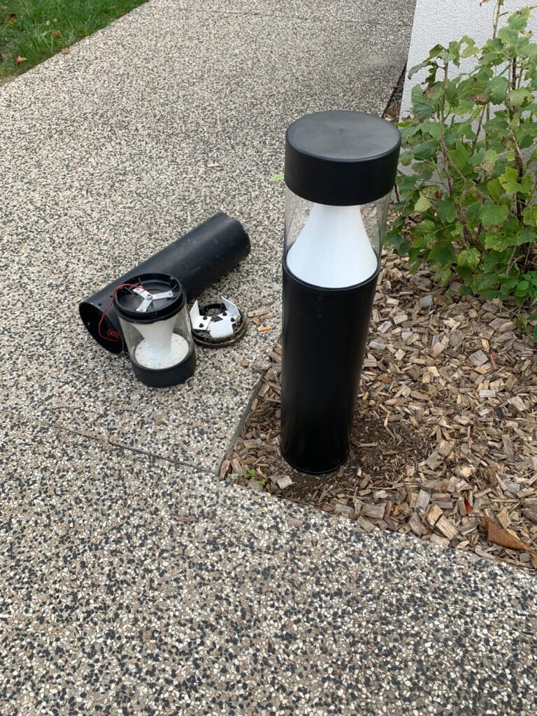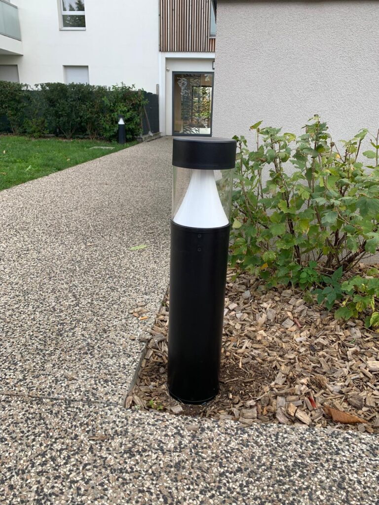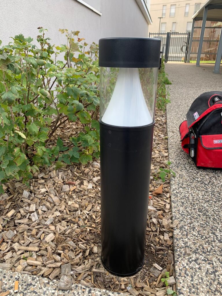 L’intervention a porté sur le remplacement d’une borne lumineuse LED installée dans les espaces communs extérieurs. L’ancienne borne a été déposée puis remplacée par un modèle LED récent, adapté aux besoins d’un usage collectif en copropriété.