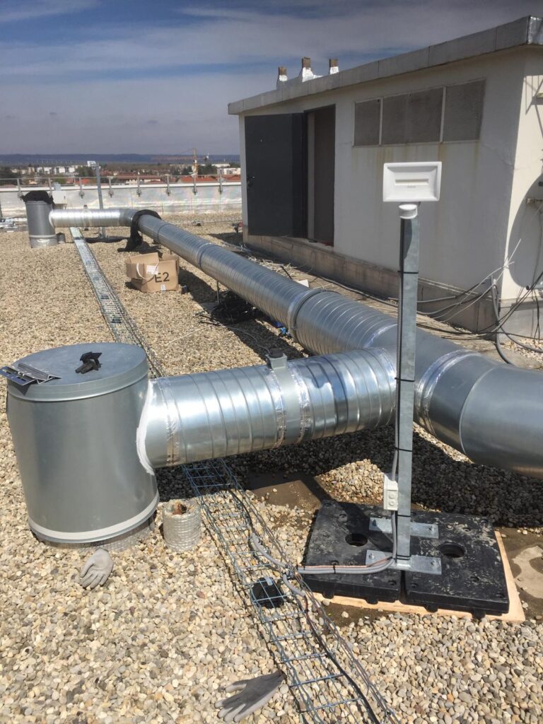Chantier réalisé sur le toit-terrasse d’un immeuble situé à Meyzieu, comprenant la mise en place d’un chemin de câbles extérieur destiné à la distribution électrique en hauteur.