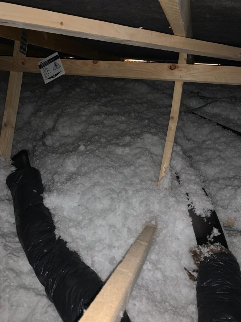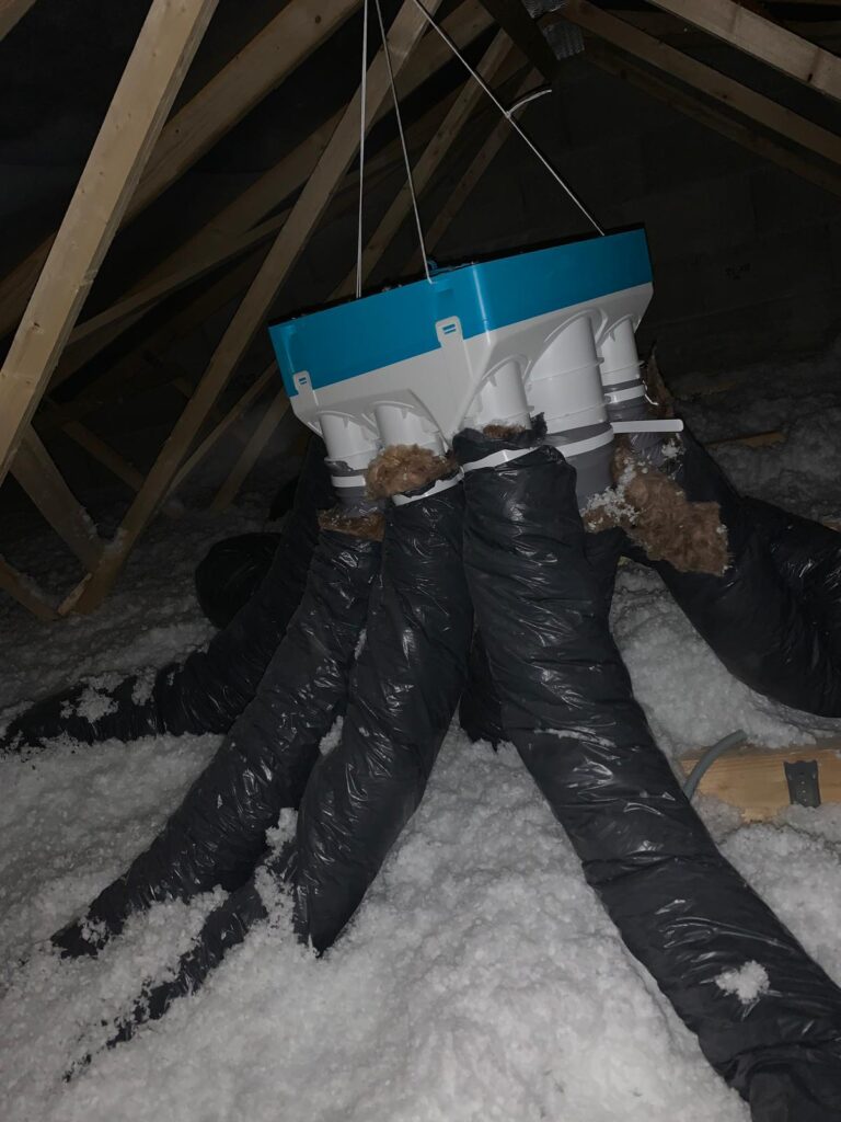 L’intervention a consisté à installer le caisson de ventilation puis à effectuer le tirage des gaines isolées, afin de limiter les pertes thermiques et d’éviter la formation de condensation dans les conduits.